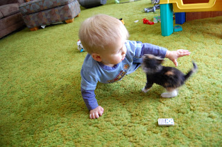 My mom got a new kitten (and it's fuzzy and tiny and adorable) and Zach has found a new comerade. He and this kitty follow each other around and Zach will plunge himself onto and snuggle into the little furball, and in turn the kitty follows Zach around batting at his feet and pretending to be fearso